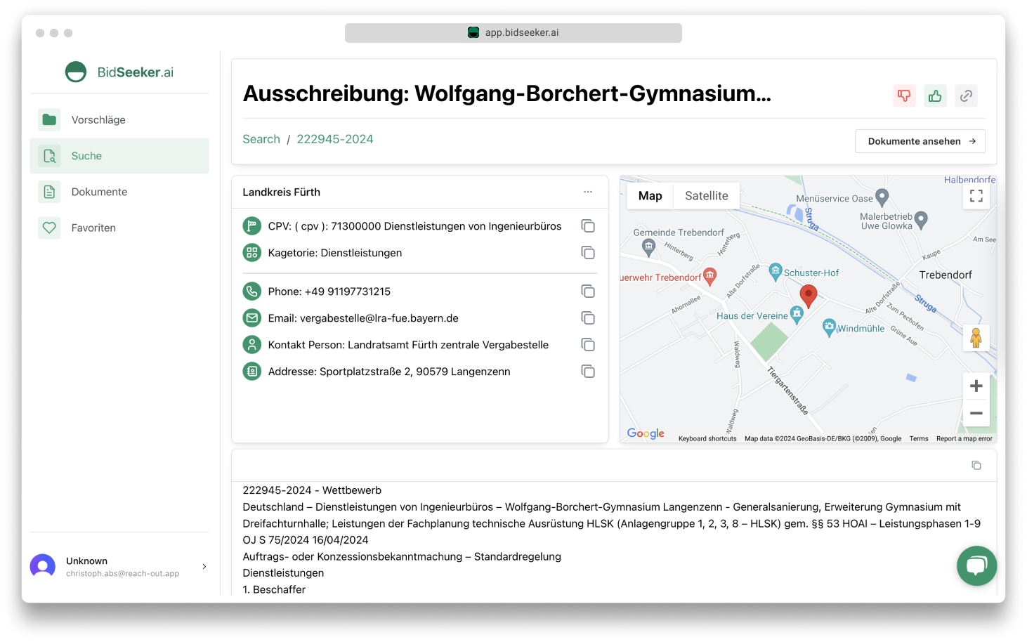 Mit wenigen Klicks erstellst du einen digitalen Zwilling deines Unternehmens, sodass die KI lernt wonach es suchen muss. Einfach die URL deiner Unternehmensseite eingeben und wir analysieren automatisch dein Businessmodel, die LinkedIn-Unternehmensseite, welche Ausschreibungen du bereits gewonnen hast und welche News es zu deinem Unternehmen gibt.